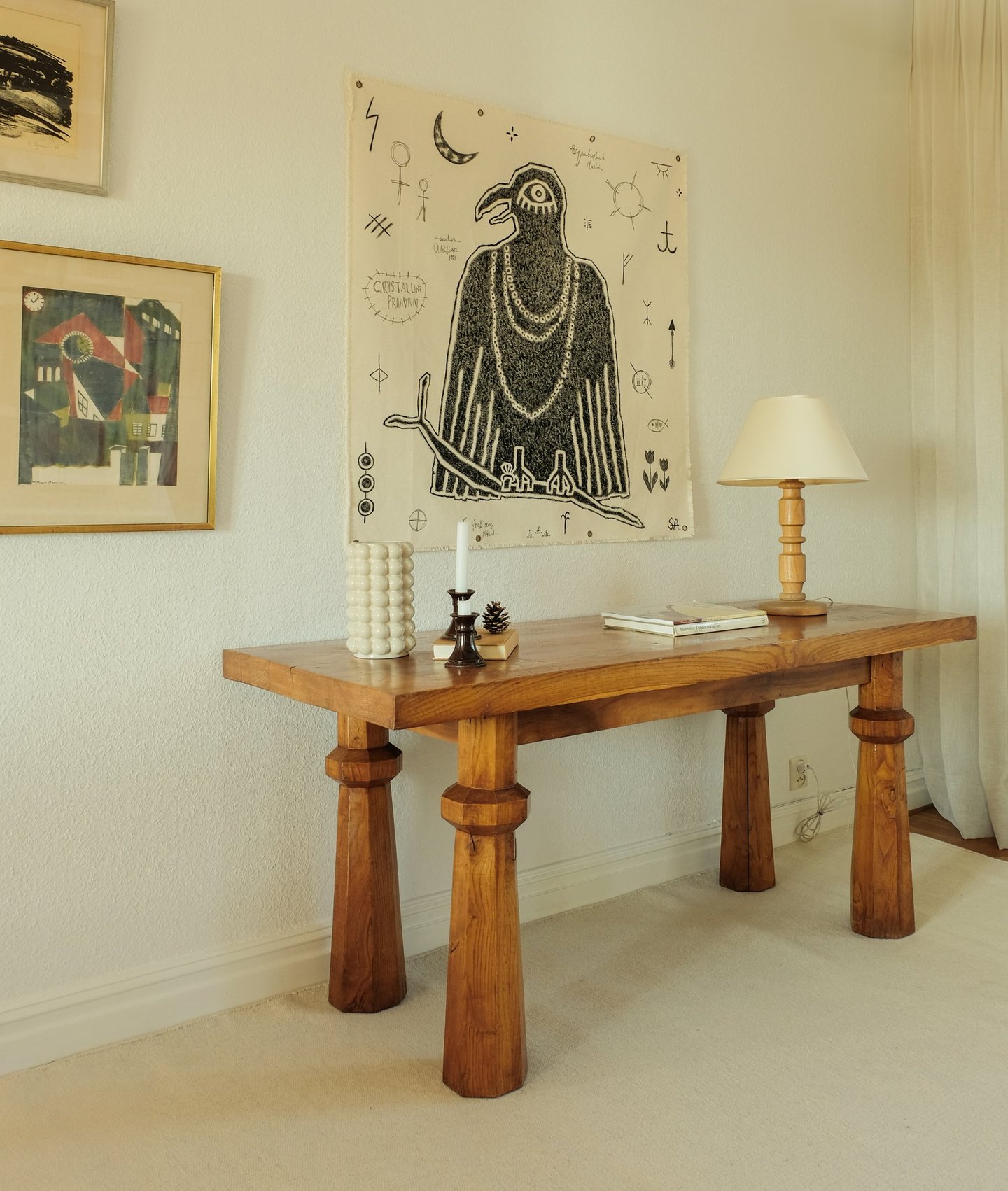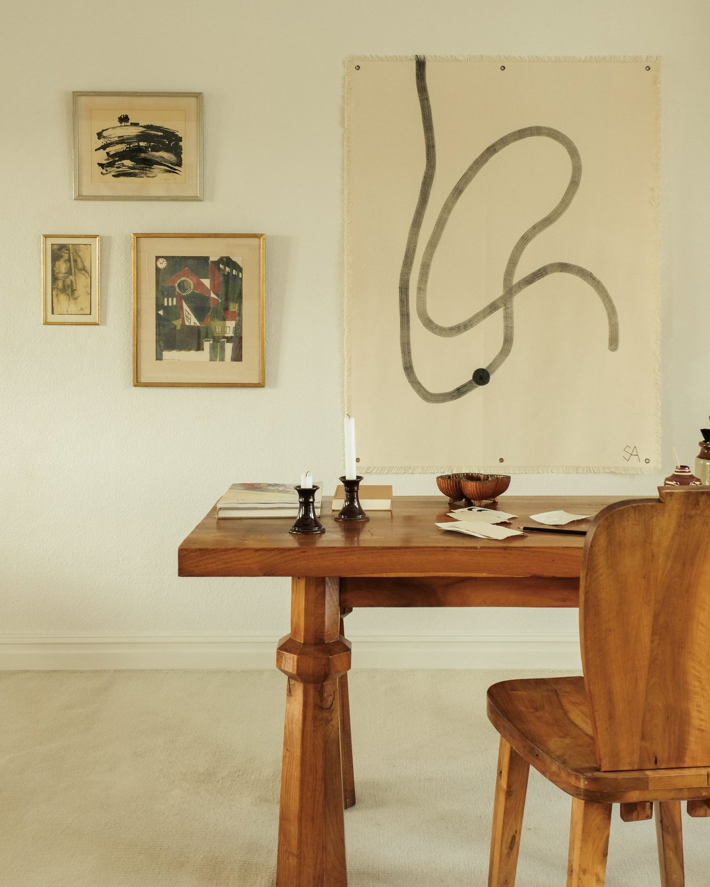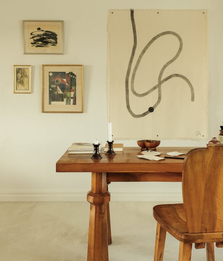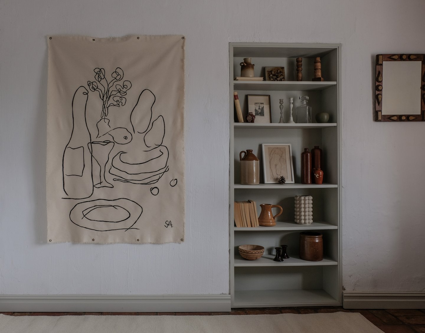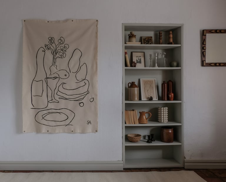 EACH TAPESTRY INVITES A SLOWER GAZE: WHAT FIRST SEEMS LIKE A BOLD SILHOUETTE UNFOLDS INTO A MINIATURE WORLD.